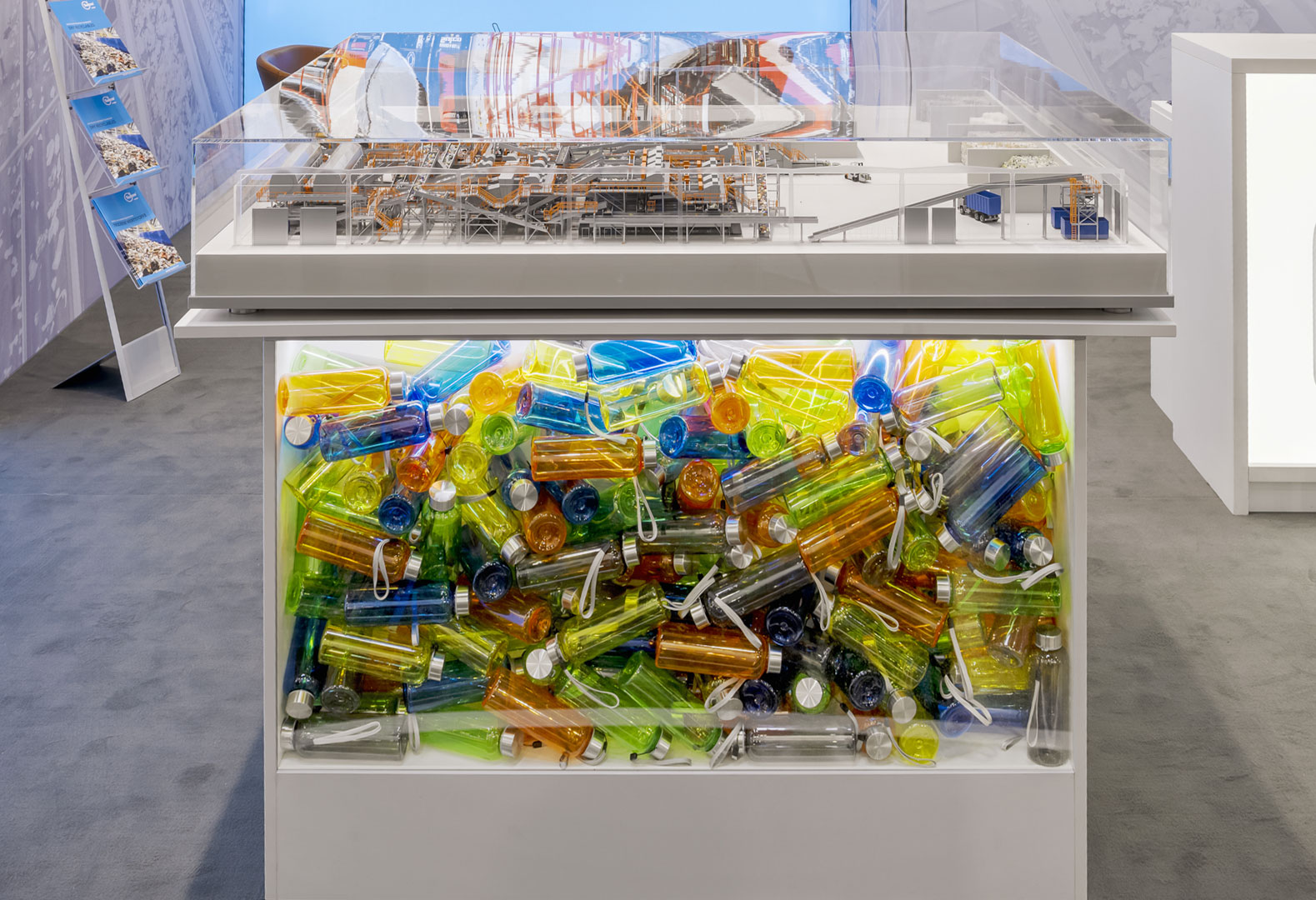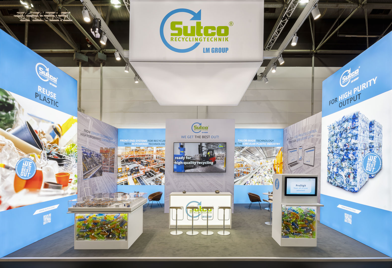 Die Bereitstellung von recycelten Grundstoffen gewinnt auch in der Kunststoffindustrie mehr und mehr an Bedeutung. Sutco nimmt in dieser Kreislaufwirtschaft mit dem Bau maßgeschneiderter Sortier- und Aufbereitungsanlagen weltweit eine Schlüsselposition ein. Gerne beteiligen wir uns als Messebauer an dieser nachhaltigen Entwicklung und stellen mit unserem Standkonzept die Abläufe bis hin zum wiedergeborenen Produkt in den Fokus der Betrachter und schaffen Raum für intensive Gespräche und Austausch.
