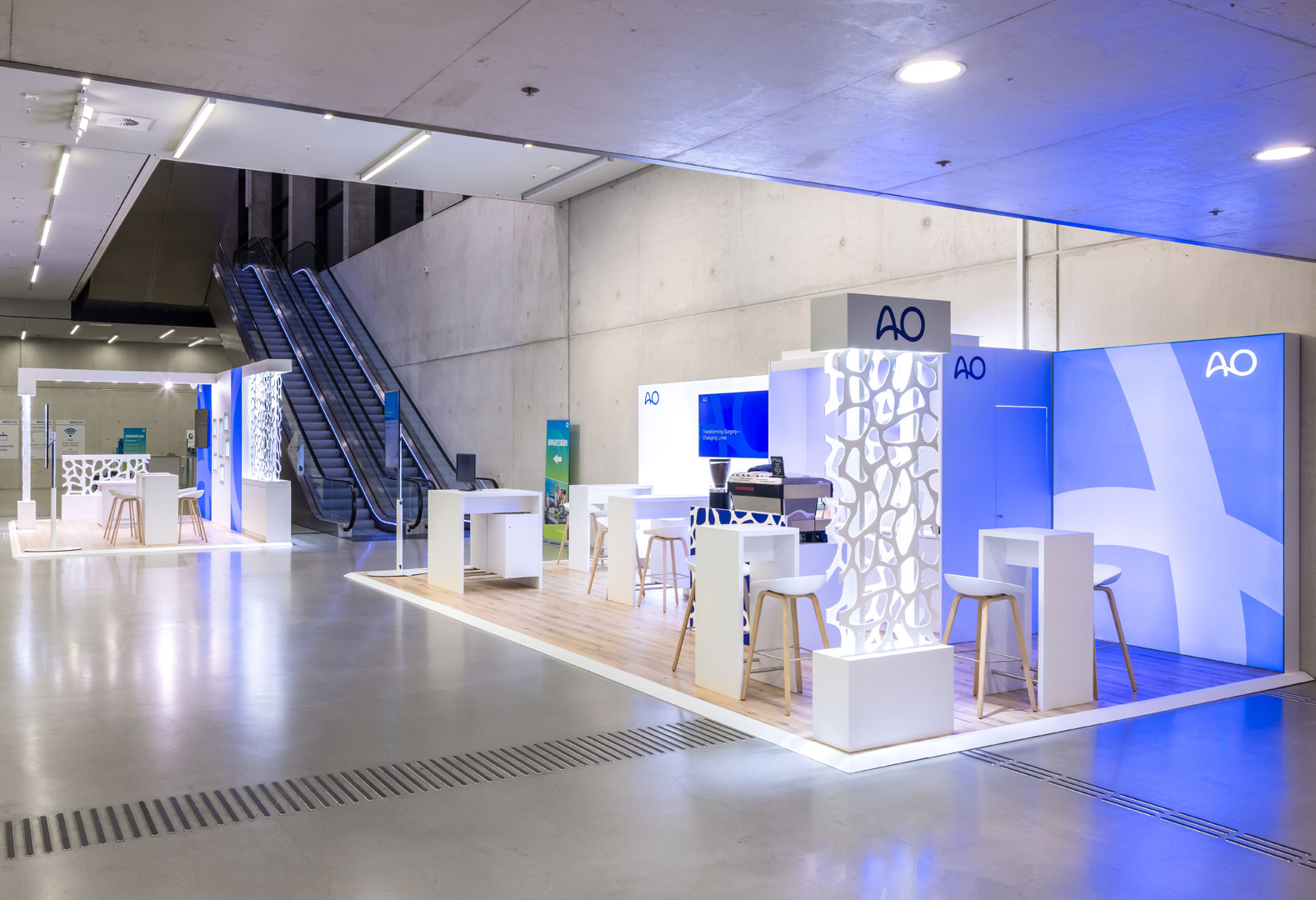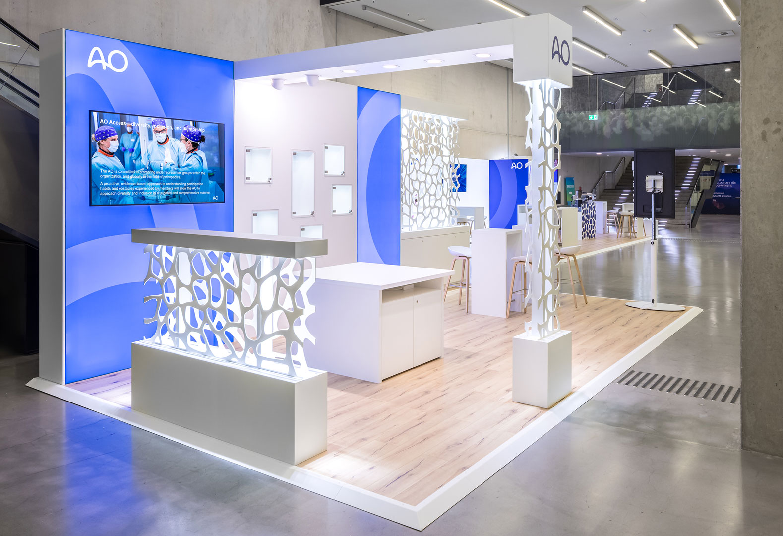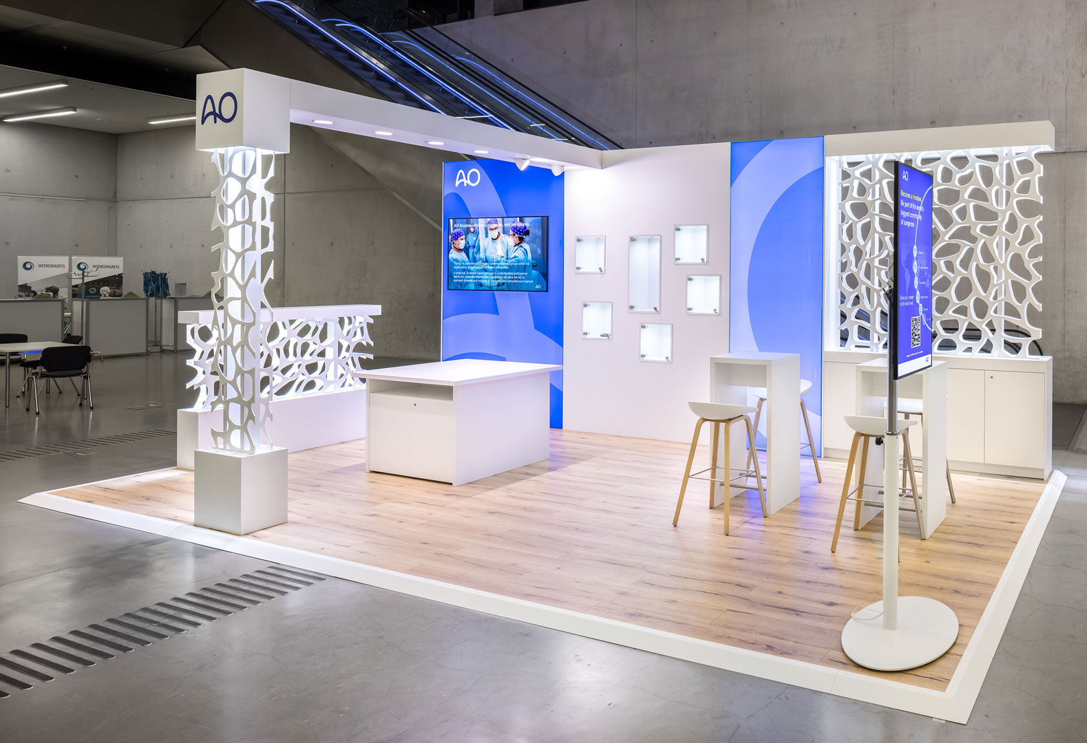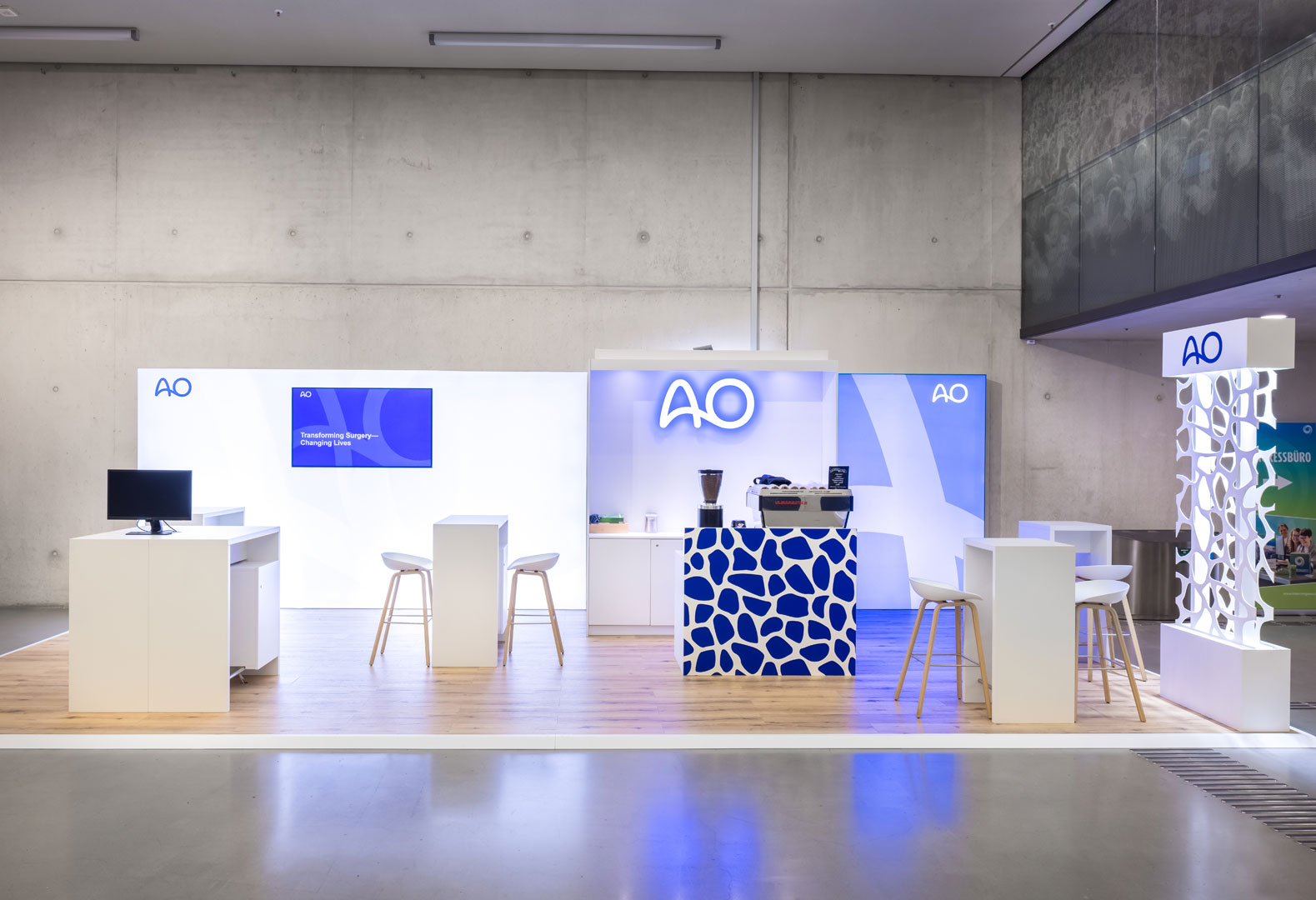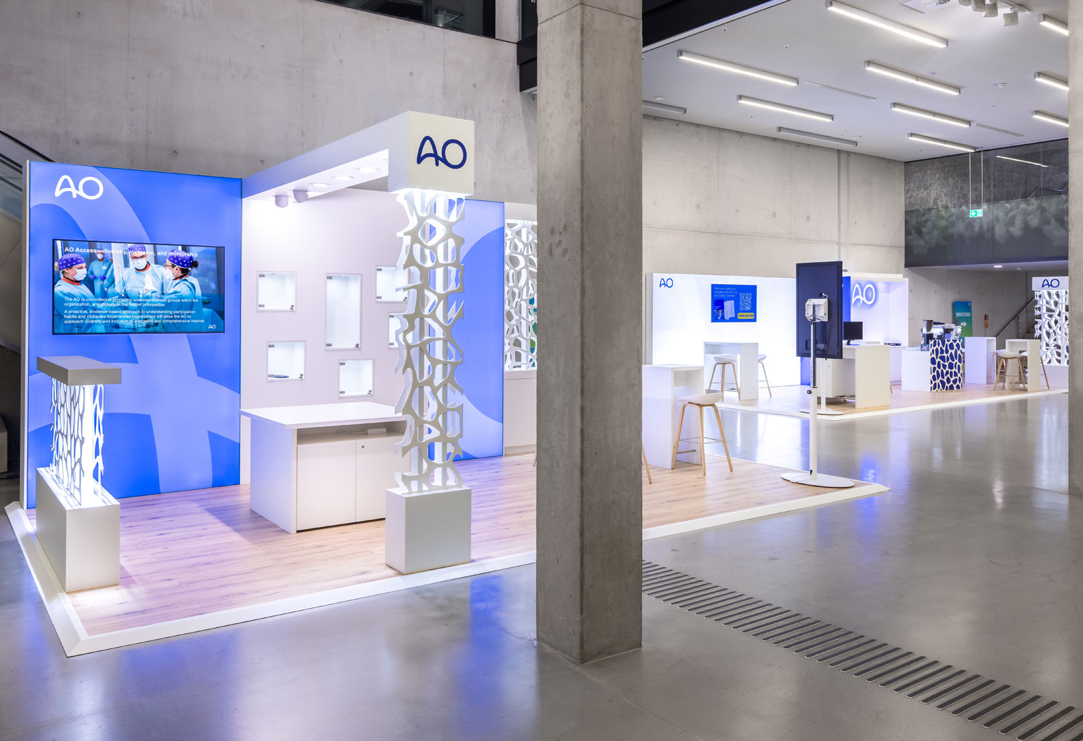 Since 2015, we've been designing and building the AO Foundation's booth at the German Congress for Orthopaedics and Trauma Surgery (DKOU) in Berlin—not out of habit, but because we continue to impress our client with fresh ideas and solutions. The AO Foundation, a nonprofit organization, regularly puts the booth concept out to tender, and for 2025, we've once again won out over the competition—our third successful pitch.