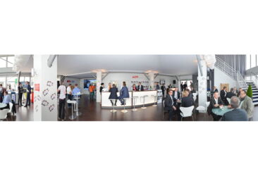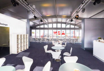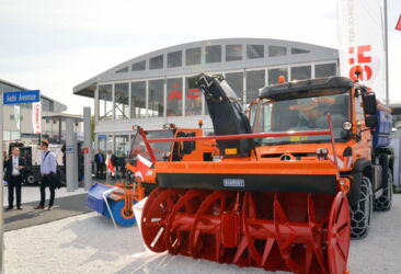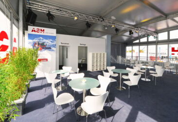 How can you present vehicles for winter tasks in summer time? With a specially built road in a winter landscape made of Carara-gravel! Here it is possible for the snow ploughs and the de-icing machines to show their value, even during temperatures far above the freezing point. The two-story tent offers with 375 square meter enough space for meetings, catering and festive evening events.