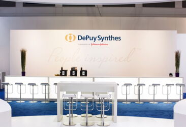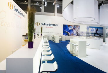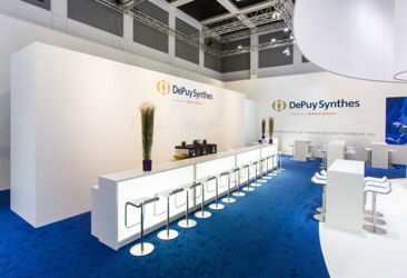 At DePuy Synthes not only the products for traumatology and neurosurgery are an all-round success - the circle is also an essential part of the logo and the company’s communication. We have therefore made the circle to the basis of our stand concept: The product tables are designed as circular cutouts, lit by floating cylinders. A deck circle with the company logo covers the entire circular presentation area. With this design we bring the circle in the center of focus.